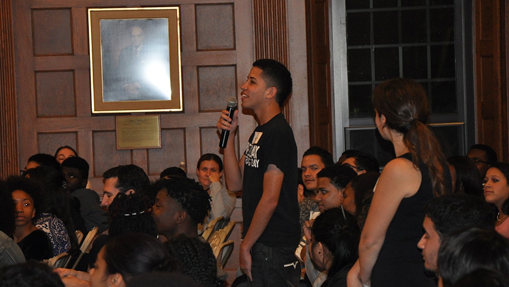 Boston student Carlos asking a question of the panel.